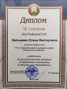 Елена Викторовна Бальцевич, учитель-дефектолог Новосёлковской средней школы Ошмянского района, награждена дипломом 3 степени в IX республиканском конкурсе «Современные технологии в специальном образовании». Желаем Елене Викторовне дальнейших творческих успехов!